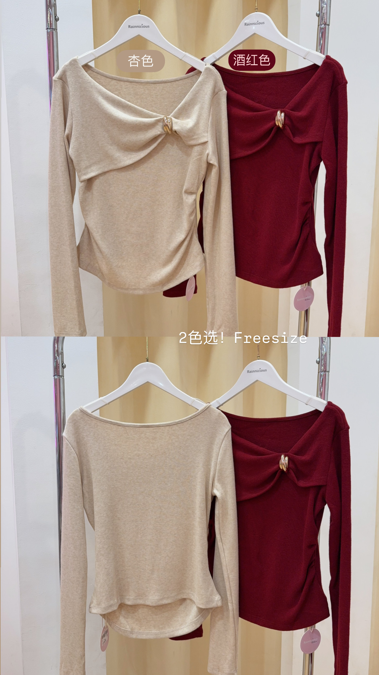 Code: R2835 韩系金属扣扭结修身针织长袖衫 Price: Rm49 Color :酒红色MaroonRed / 杏色Beige Size : Freesize Bust : 82-124cm Sleeve : 58cm Length : 47cm Shoulder:38cm