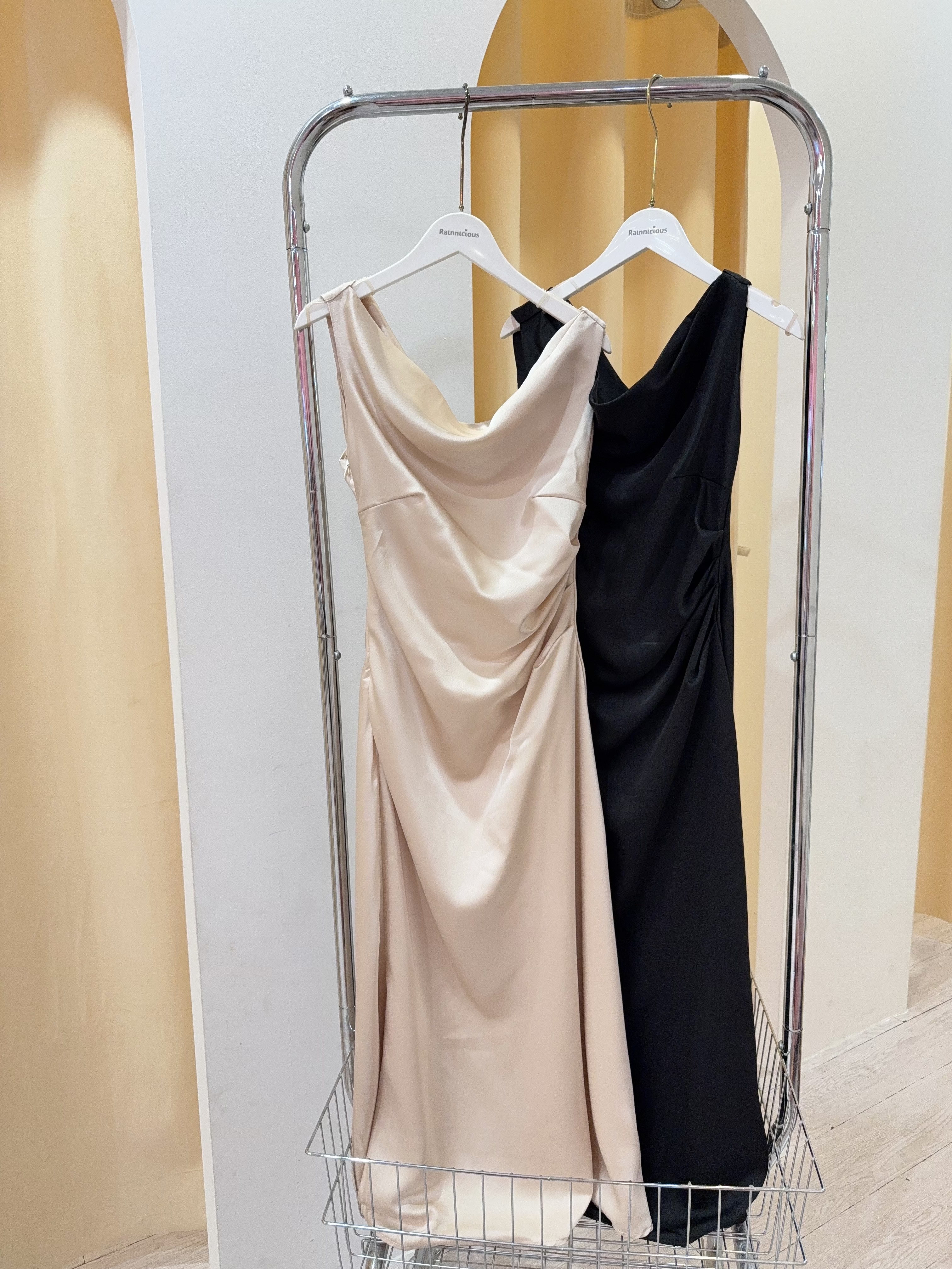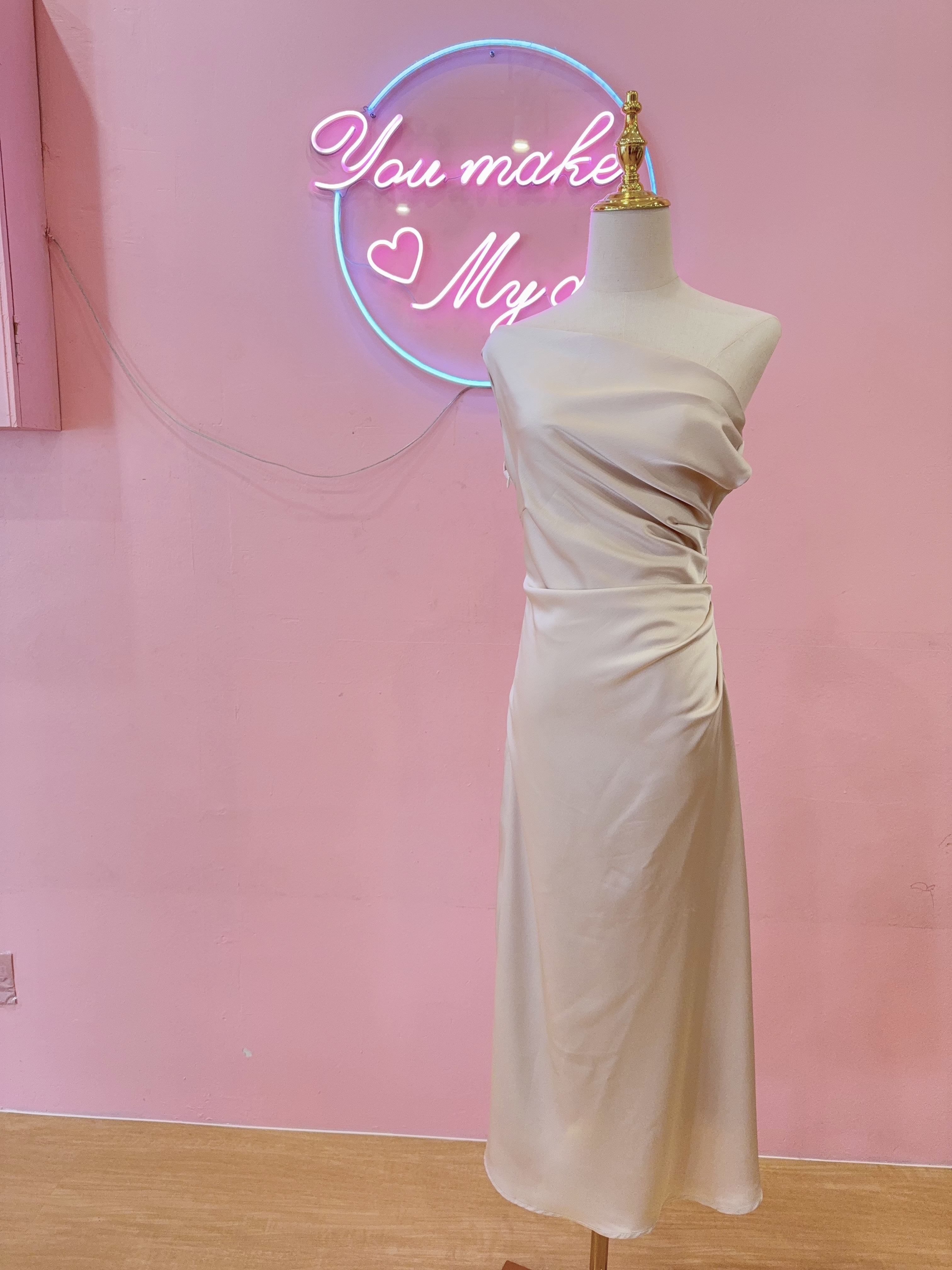 Code: R2750 高级斜肩缎面礼服长裙 Price: Rm89 Color : 香槟色champagne /黑色black Size : S/M S Bust : 86cm Length : 118cm Waist : 64cm Hip : 90cm M Bust : 90cm Length : 118cm Waist : 70cm Hip : 106cm