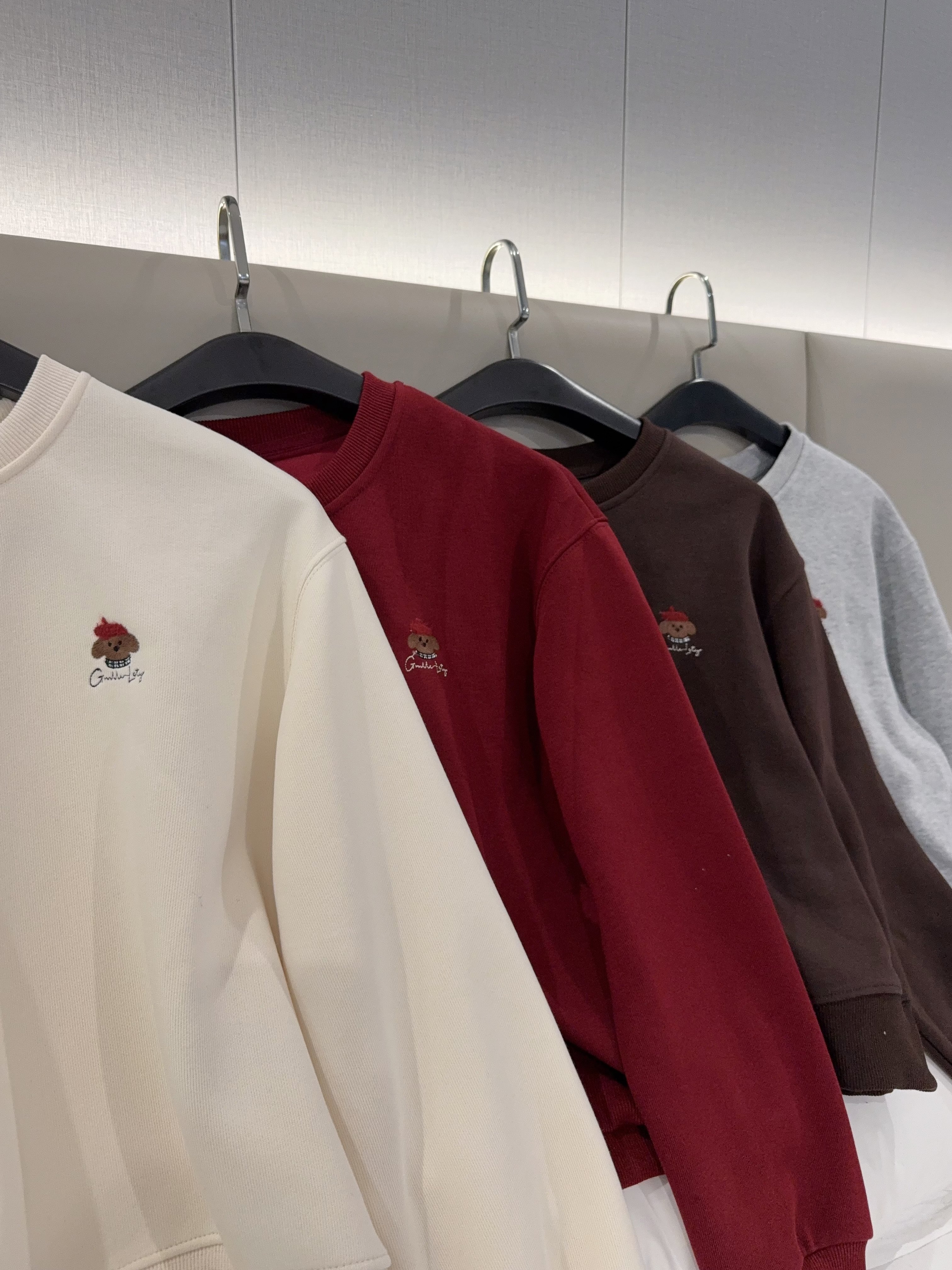 Code:R2825可爱刺绣毛绒熊长袖卫衣 Price: Rm59 Color :奶杏Beige/酒红Red/灰色Grey/可可Brown Size : Freesize Bust:120-140cm Length:55cm Shoulder: 53cm Sleeve:53cm
