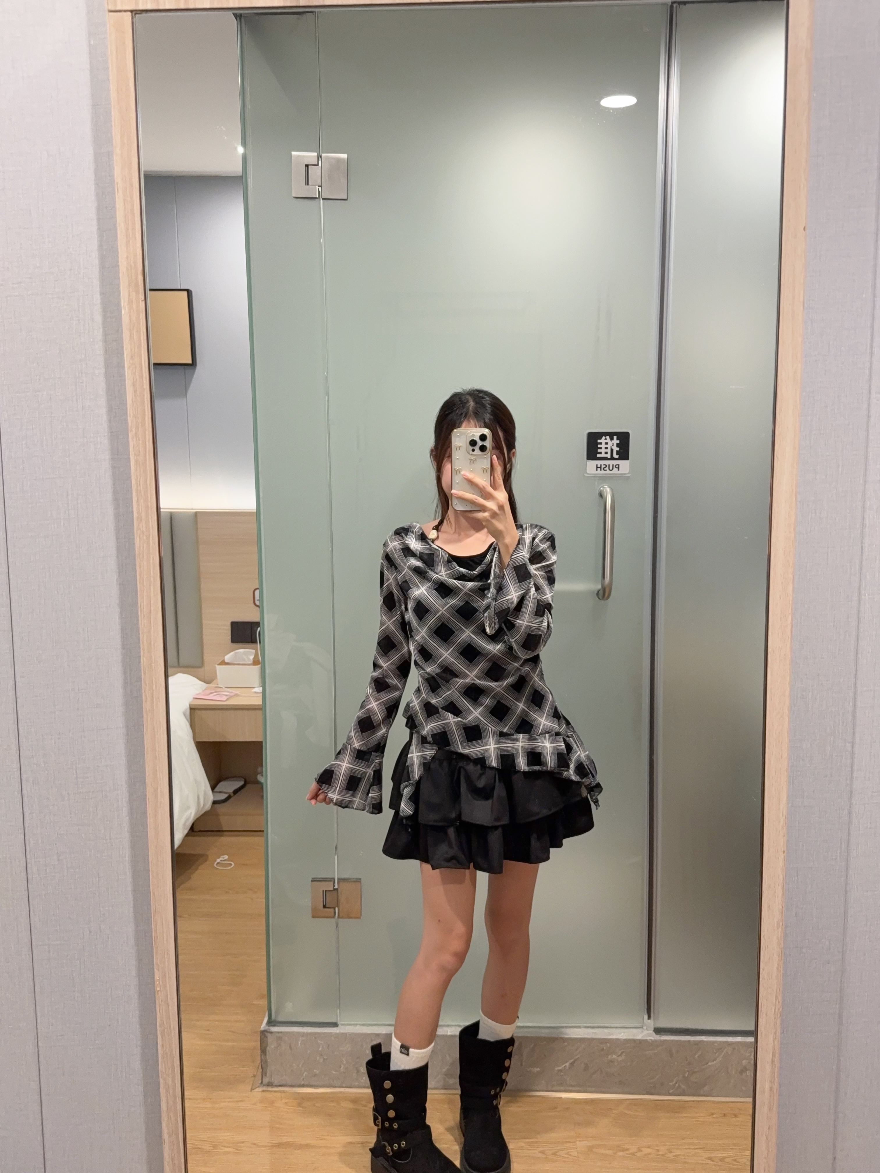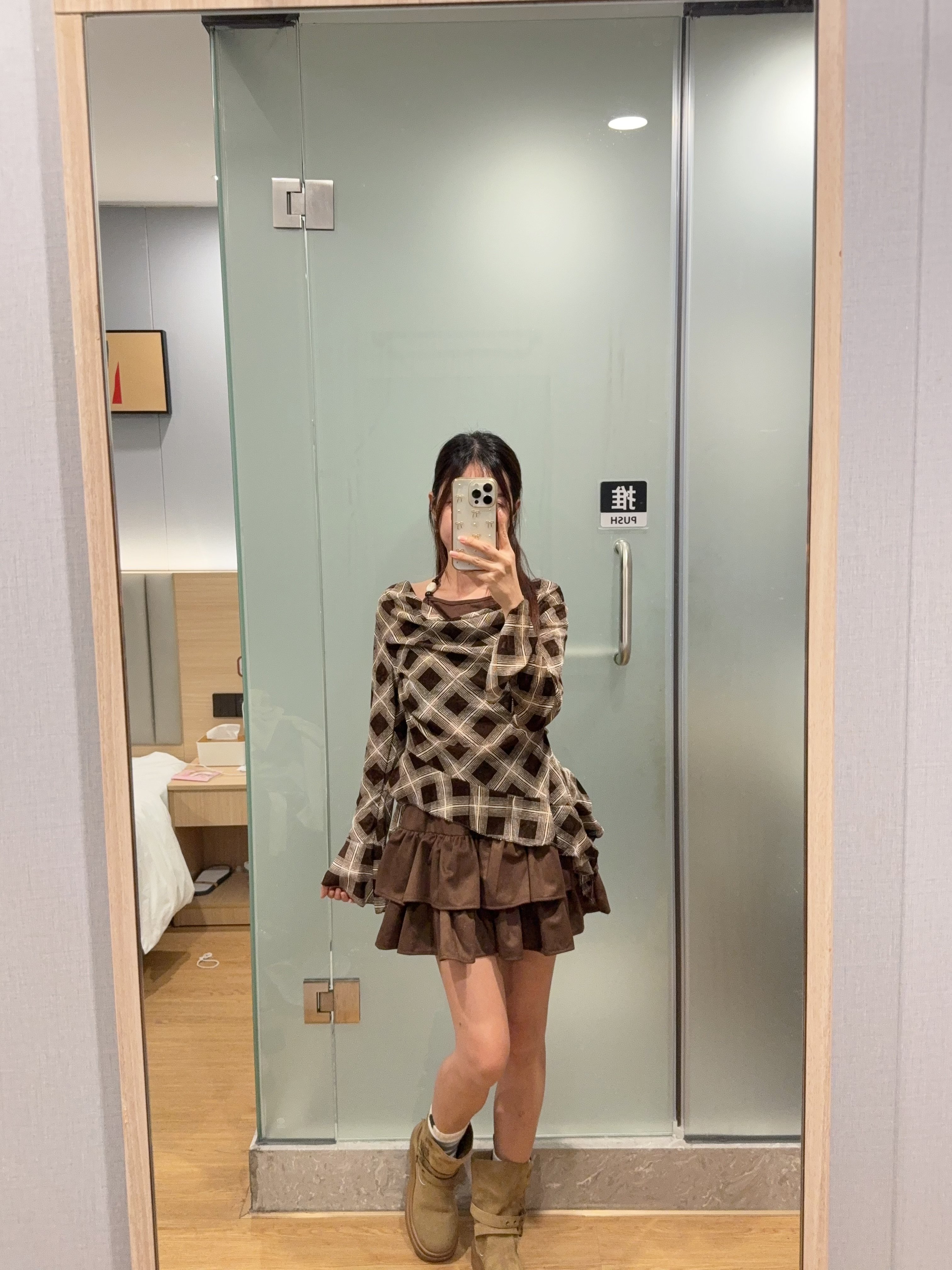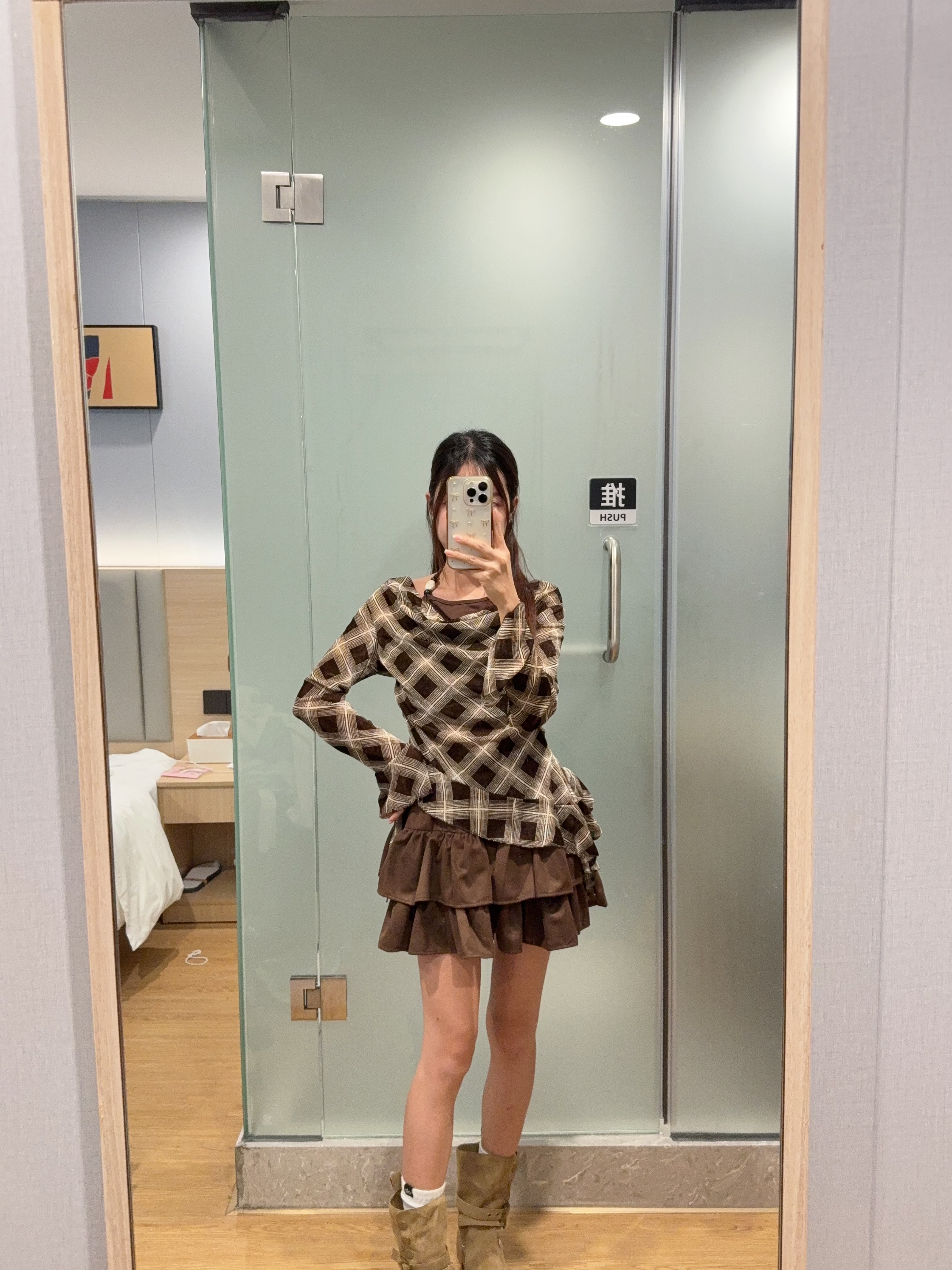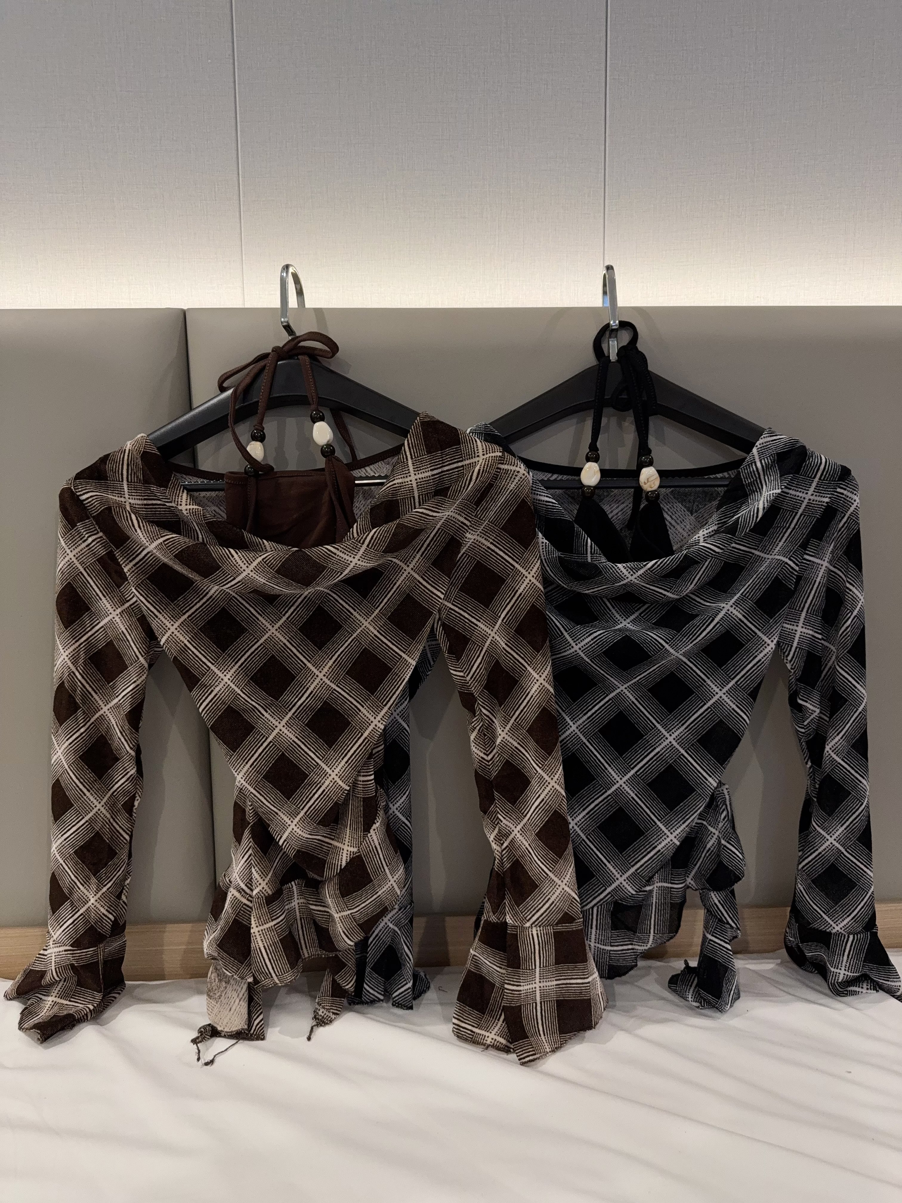 Code: R2855复古格子挂脖假两件长袖衫 Price: Rm45 Color :咖啡色Coffee/黑色Black Size : Freesize Bust:80-120cm Length:50cm Shoulder: 40cm Sleeve:58cm