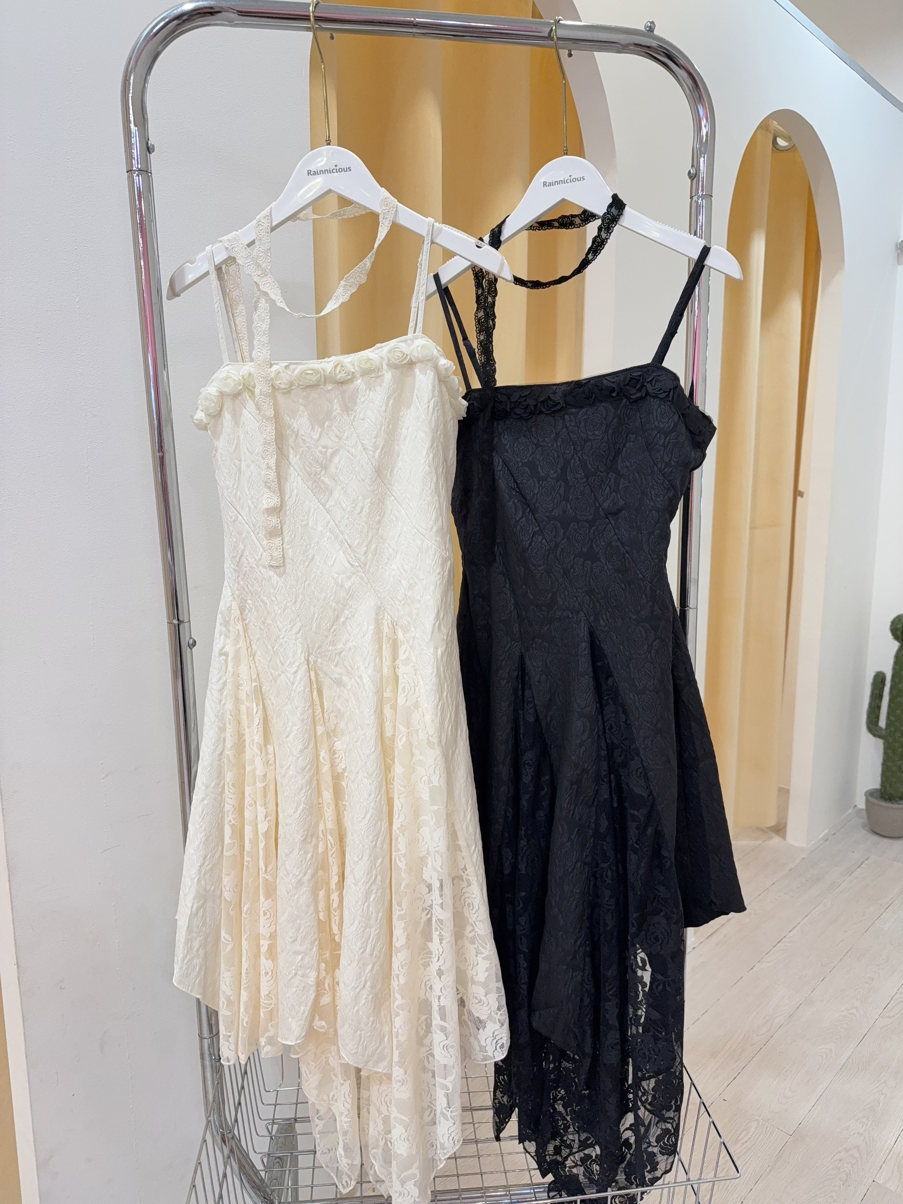 玫瑰蕾丝拼接不规则吊带连身裙 R2584
