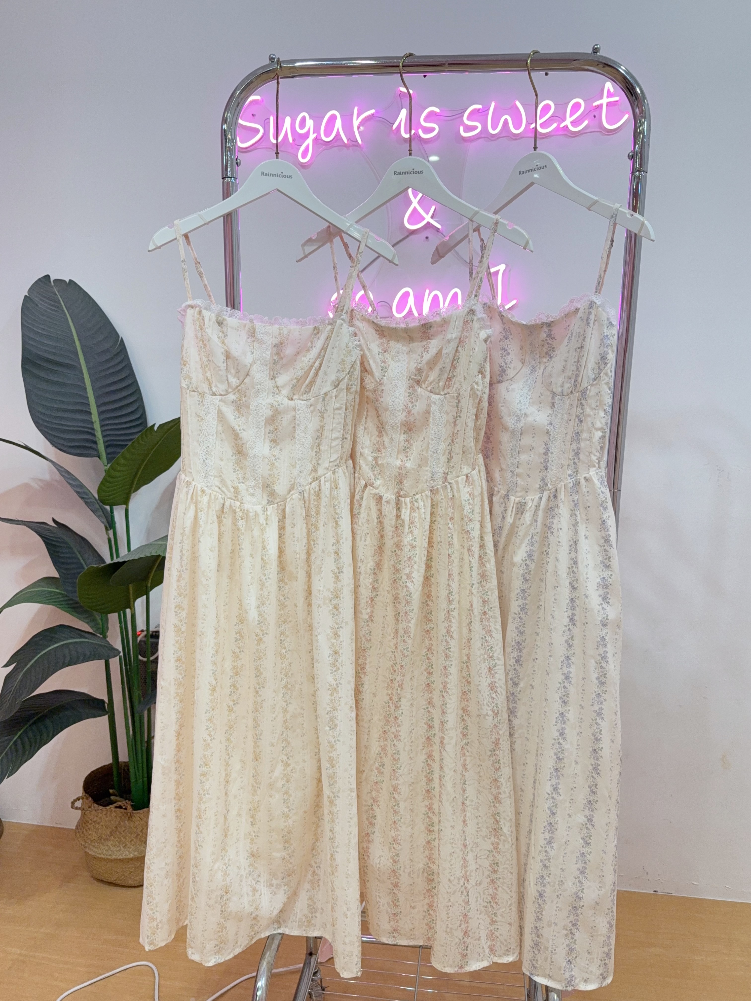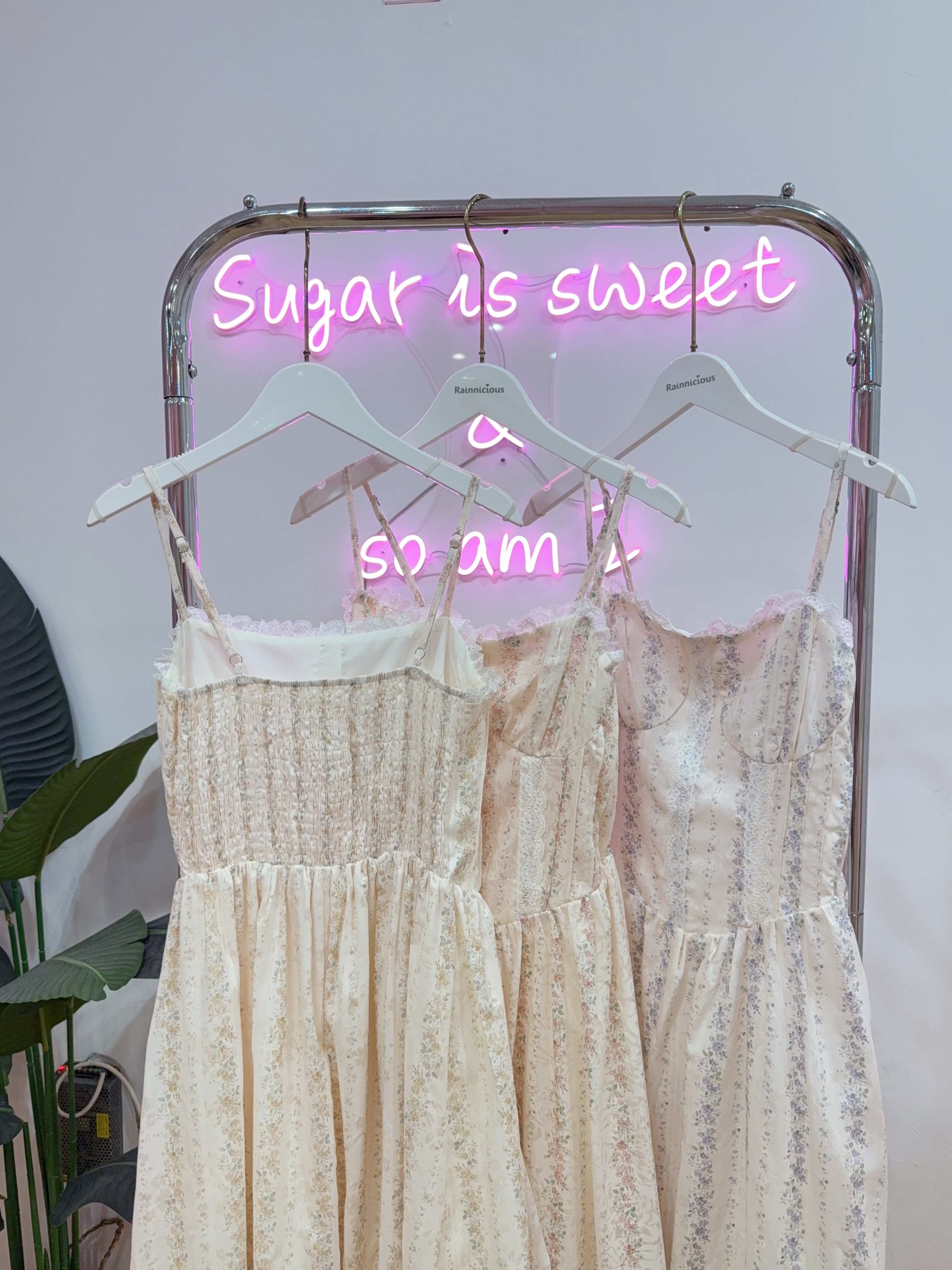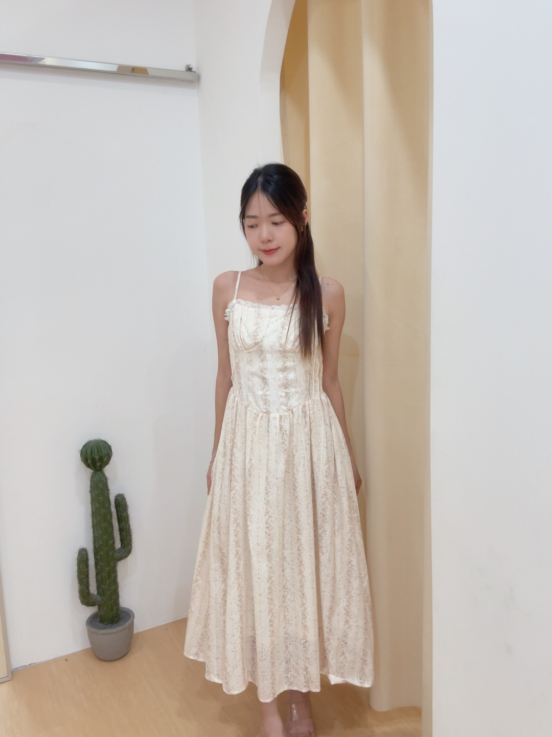 Code:R2604 田园风碎花蕾丝吊带连身长裙 Price: Rm79 Color :杏色Beige / 粉色Pink / 薰衣草色Lavender Size : Freesize Bust : 68-100cm Length : 102cm(不包括肩带测量) Waist : 56-80cm Hip : 132cm