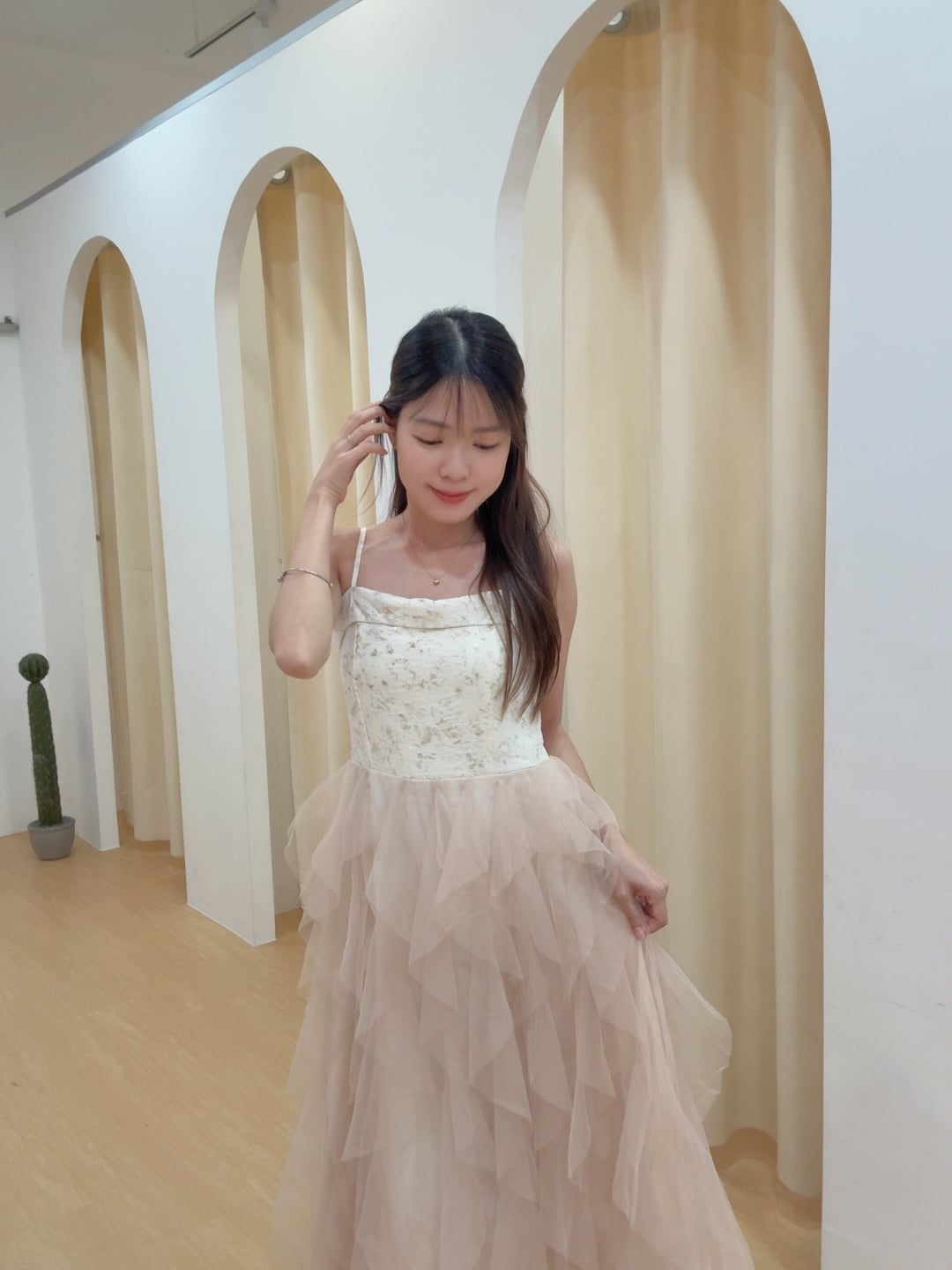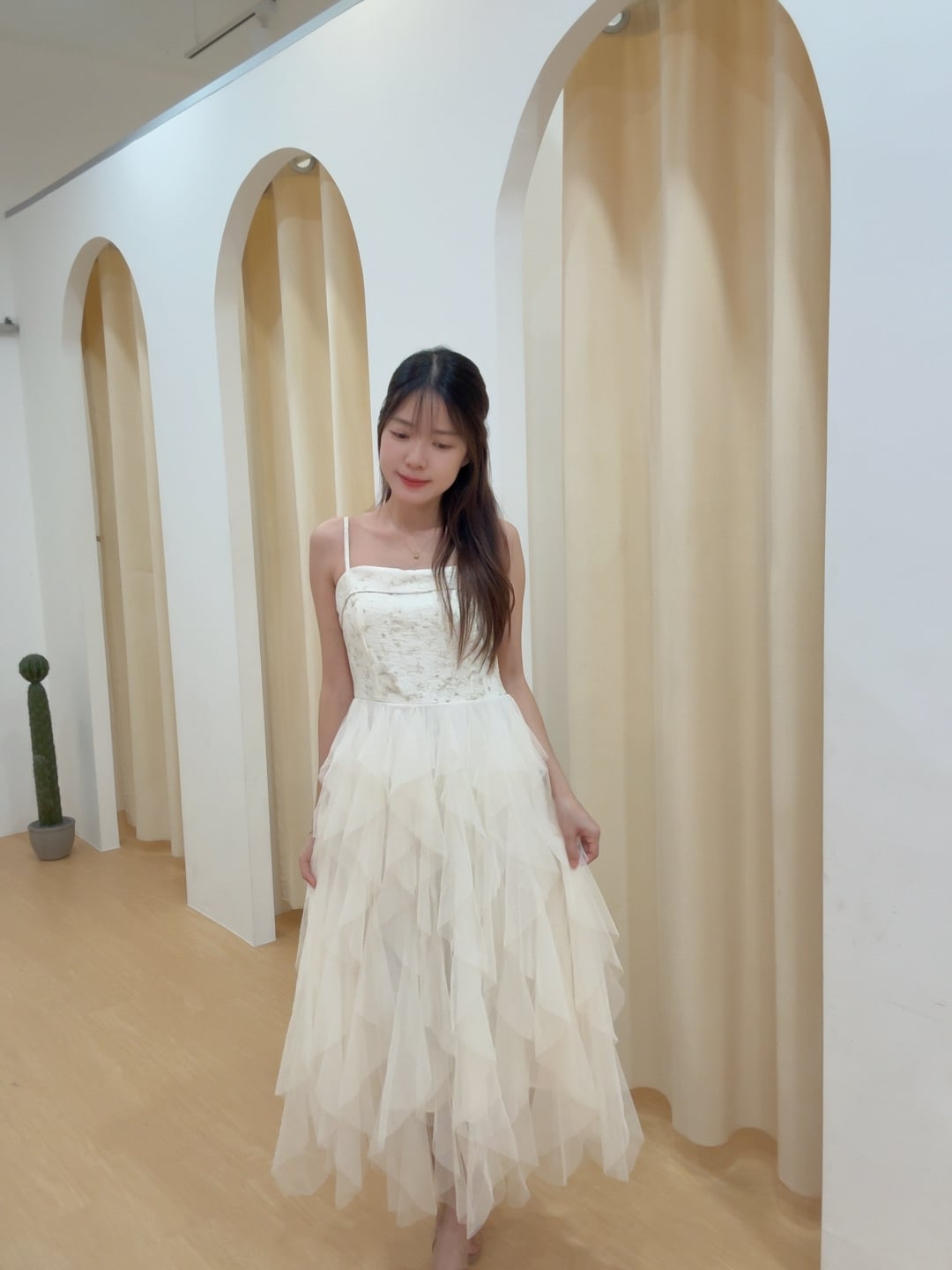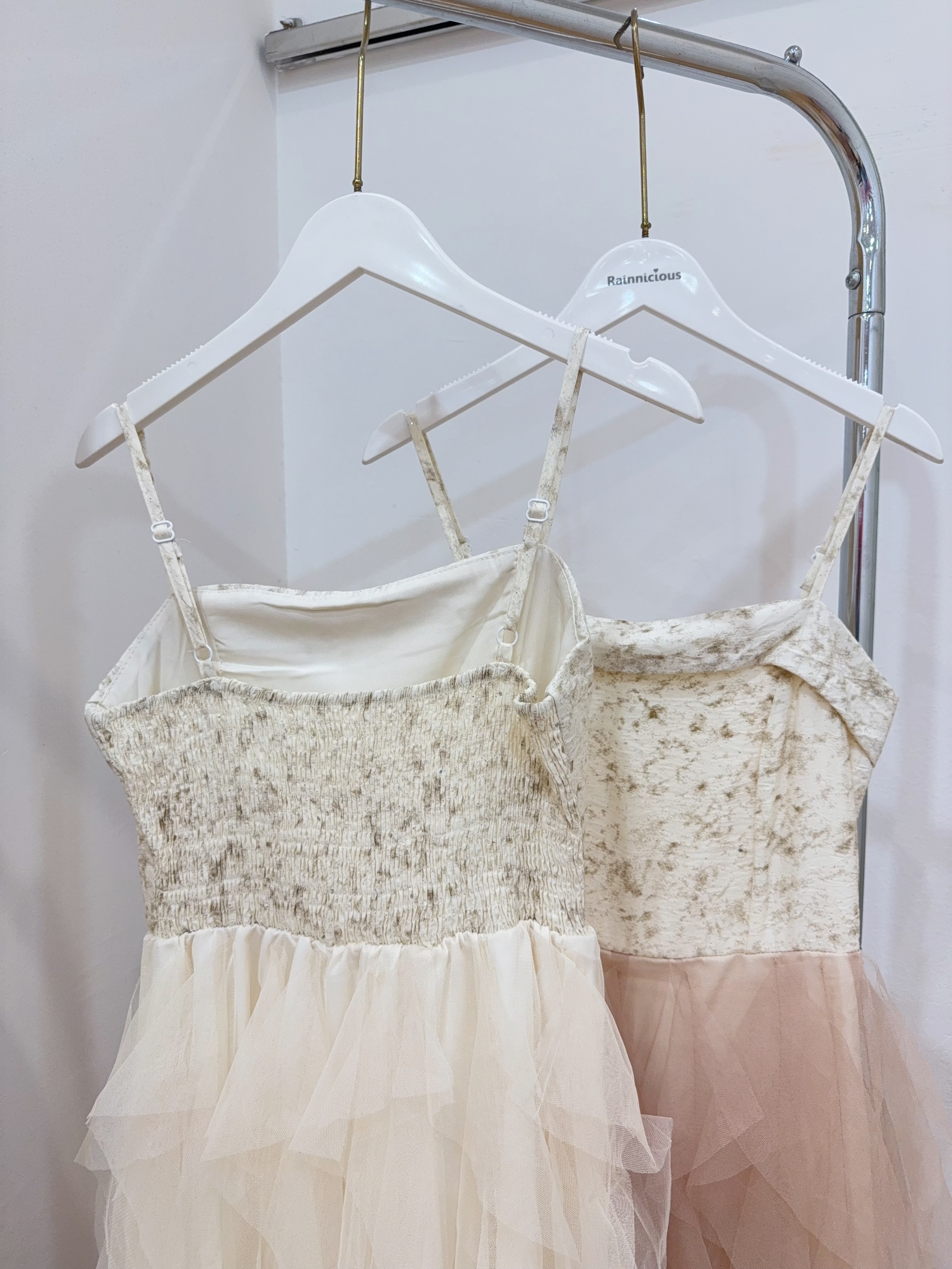 Code:R2610 超仙网纱层次感拼接吊带连身裙 Price: Rm85 Color :杏色Beige / 香槟色Champagne Size : Freesize Bust : 72-90cm Length : 105cm(不含背带) Waist : 64-90cm Hip : 120cm