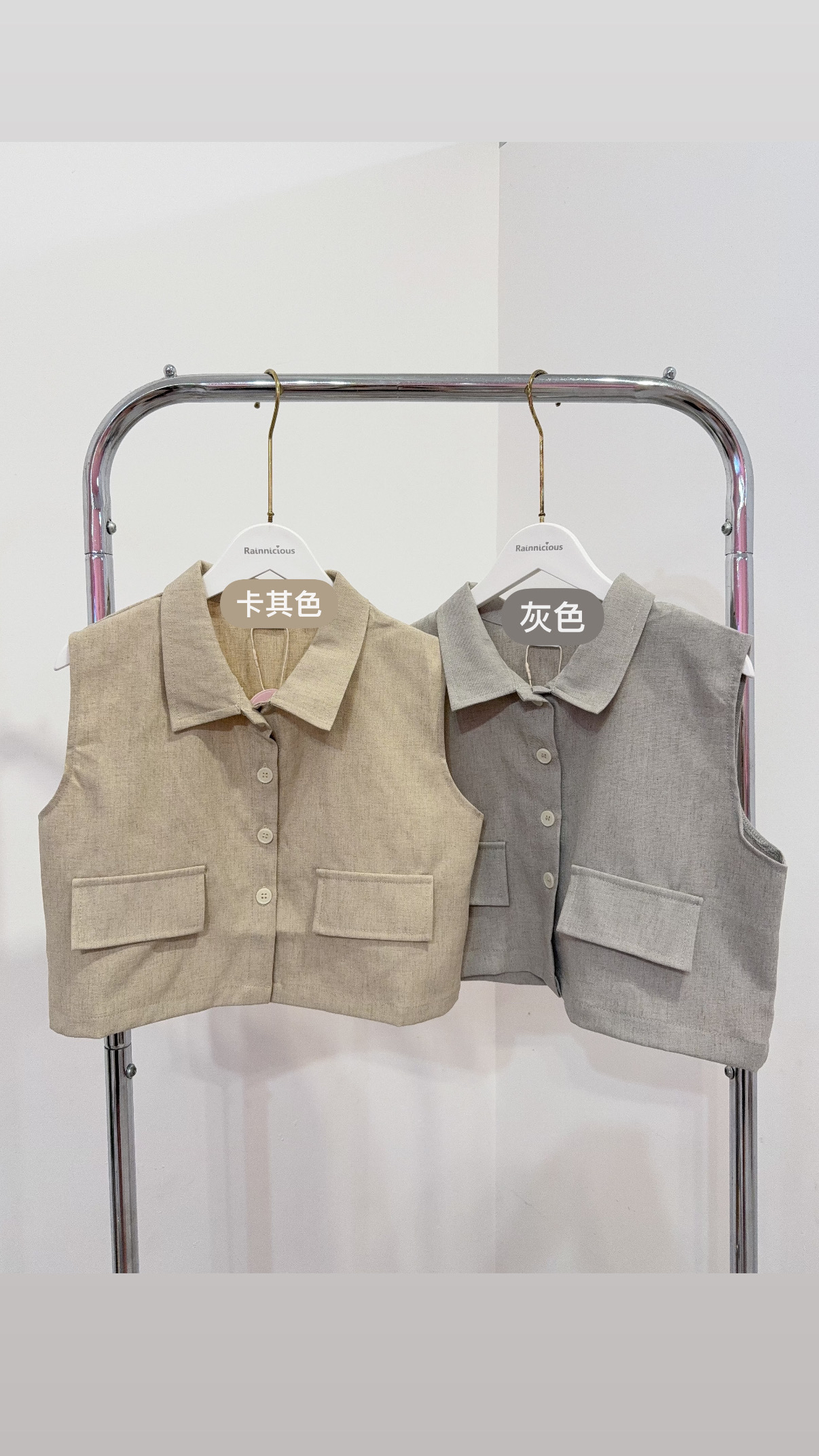 Code: R2485 酷帅翻领工装无袖马甲上衣 Price: Rm45 Color : 灰色grey / 卡其khaki Size : Freesize Bust : 98cm Length: 37cm