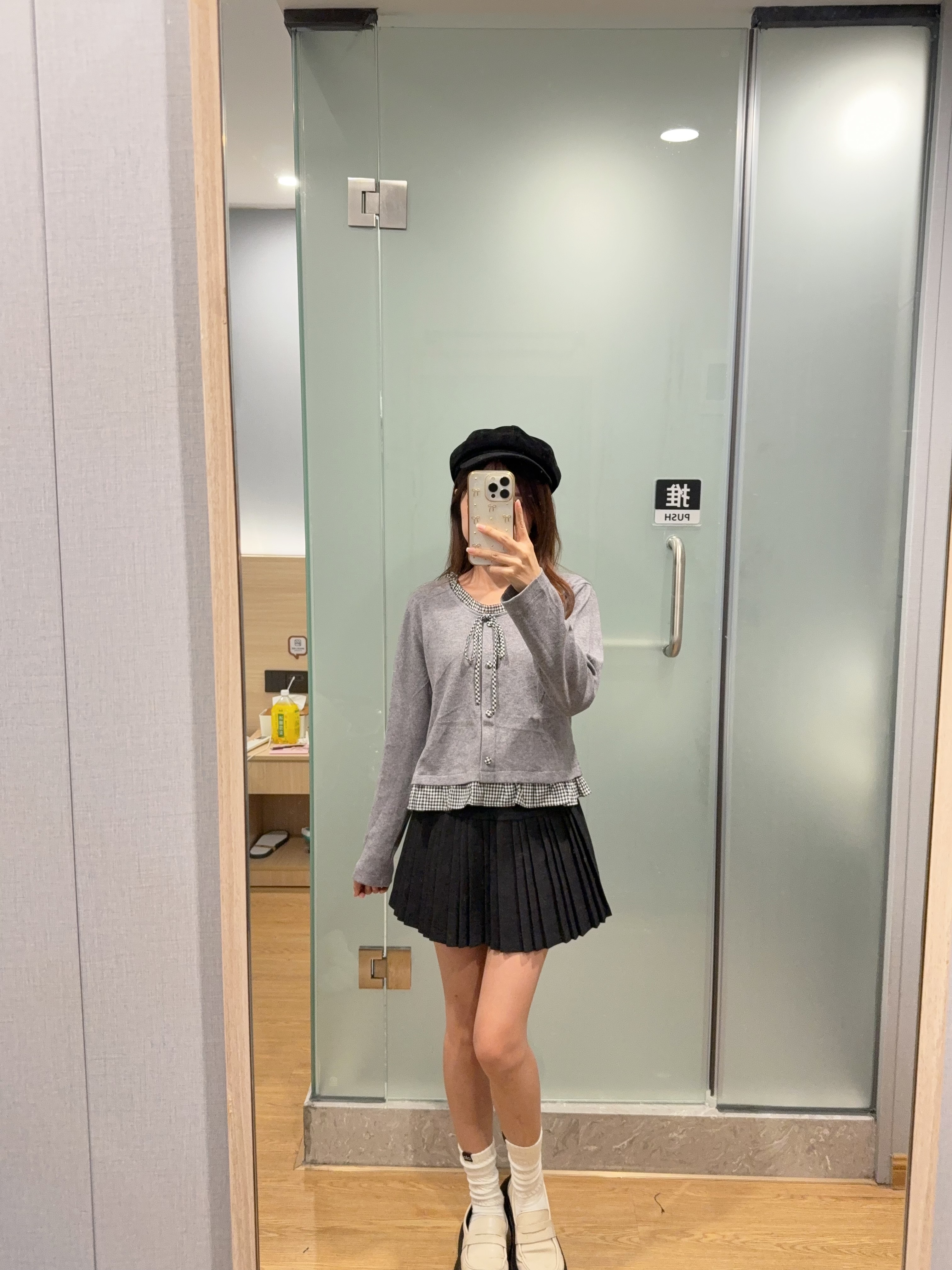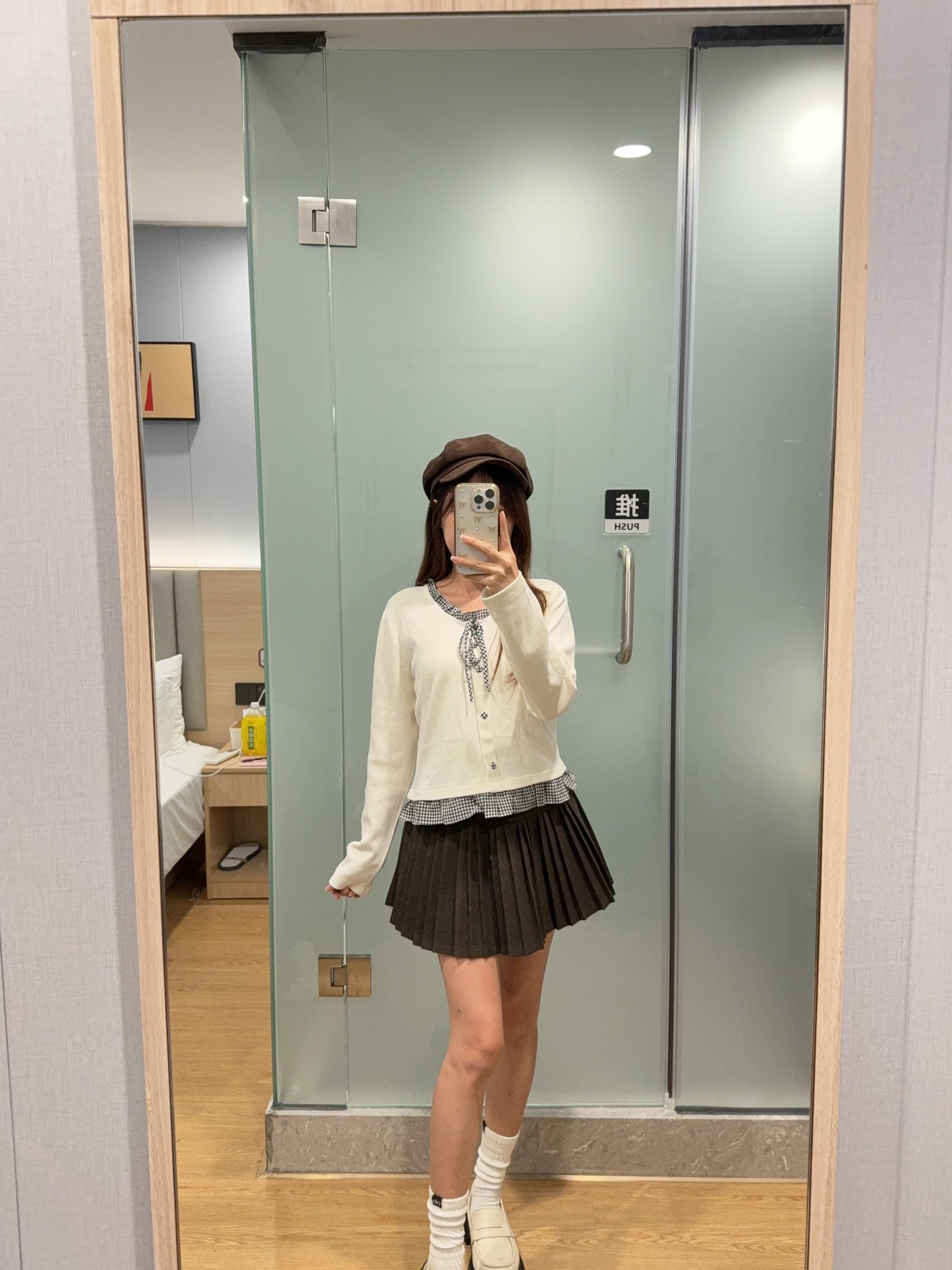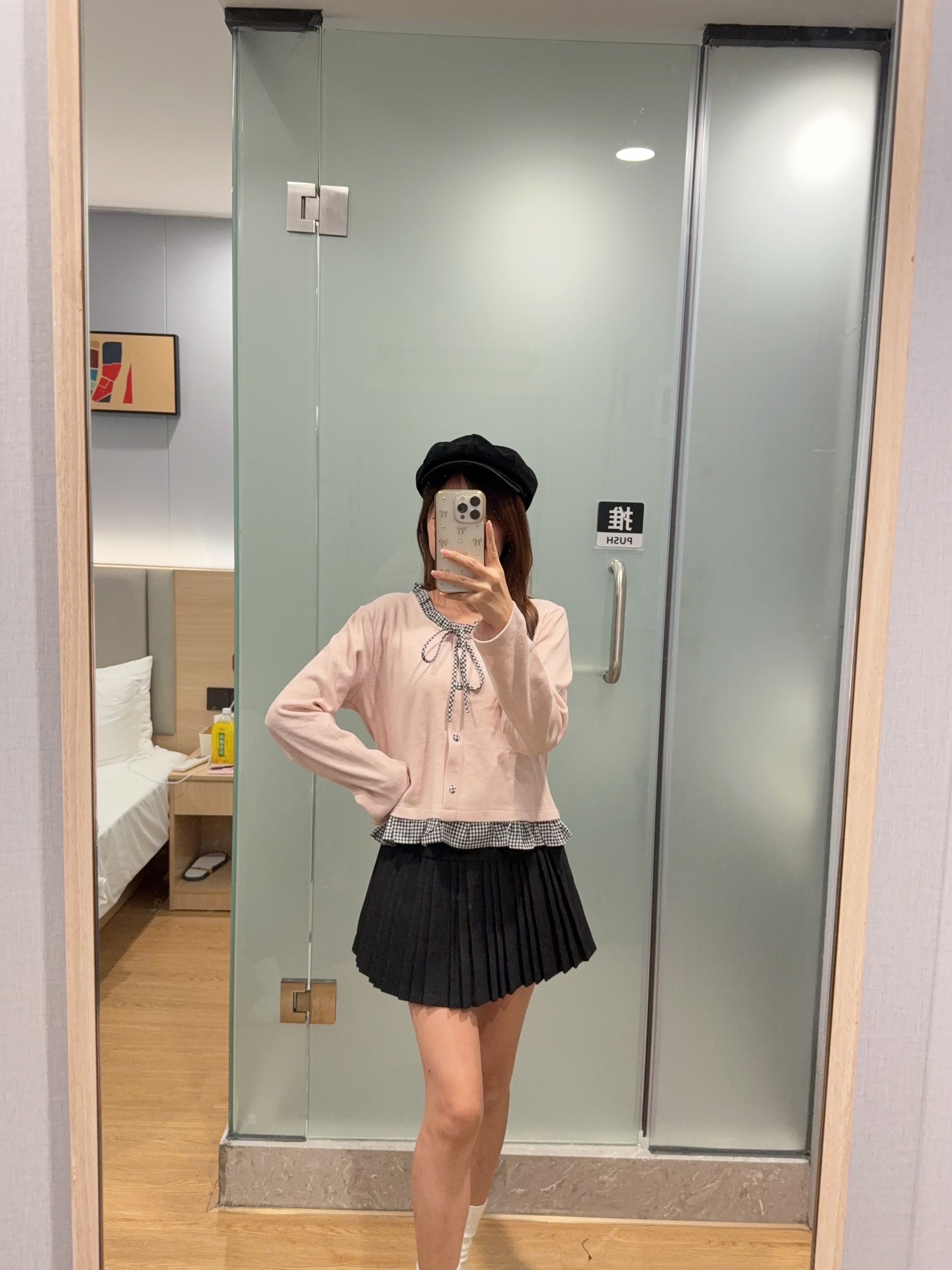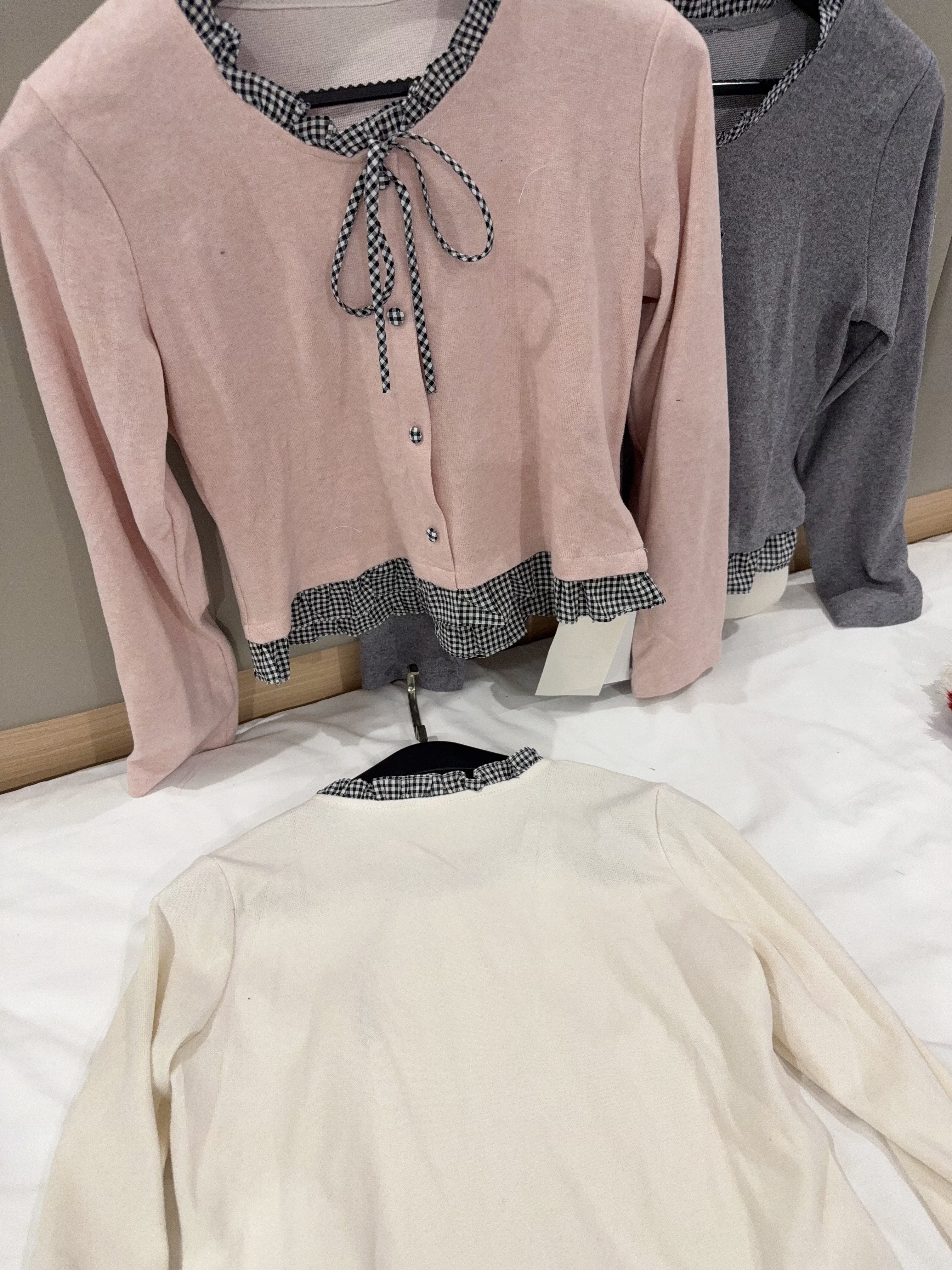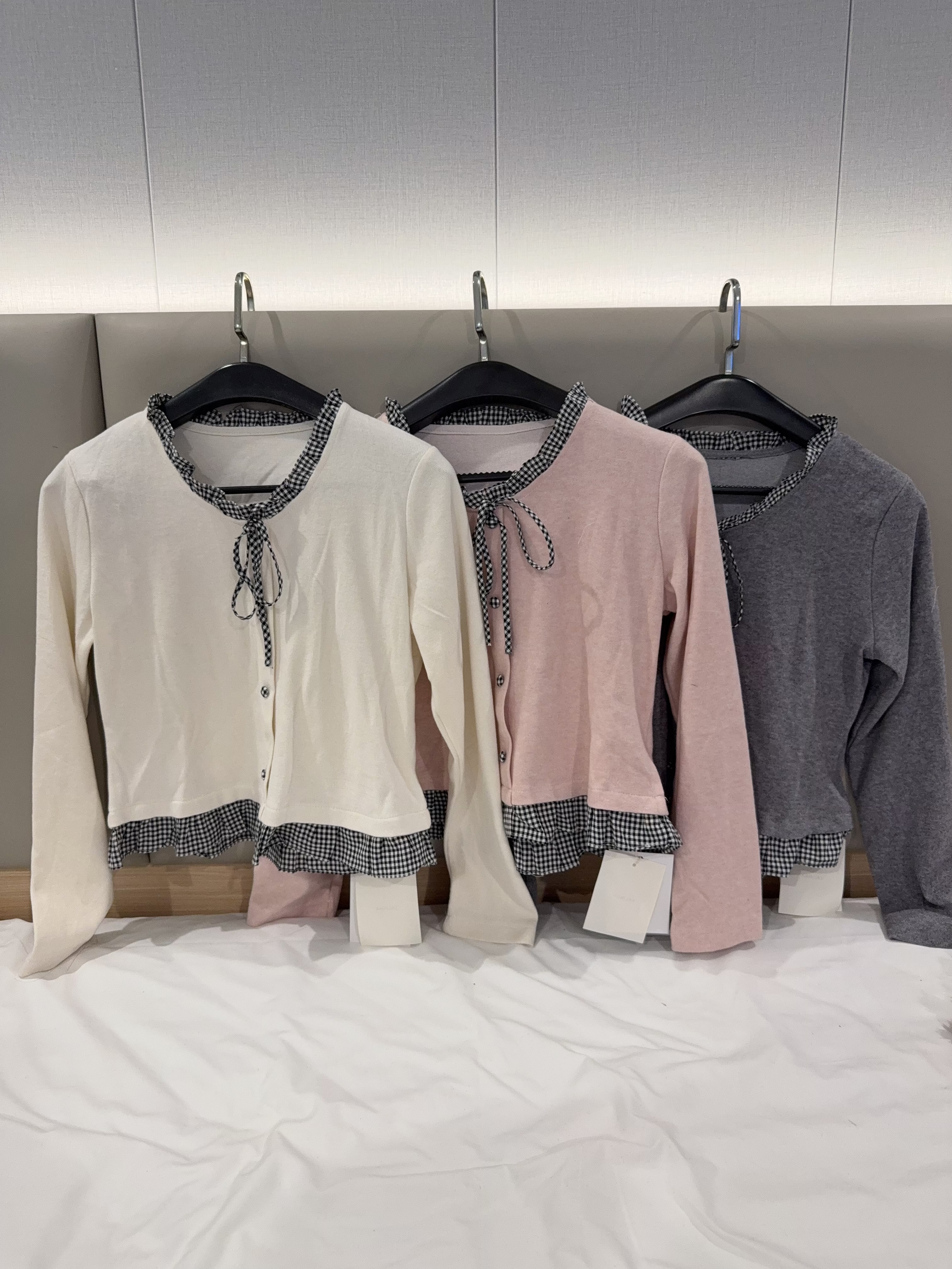 Code: R2845 韩系木耳边格子拼接娃娃长袖上衣 Price: Rm52 Color :奶白色CreamWhite/浅粉色Pink/灰色Grey Size : Freesize Bust:92-130cm Length:49cm Shoulder: 39cm Sleeve:57cm