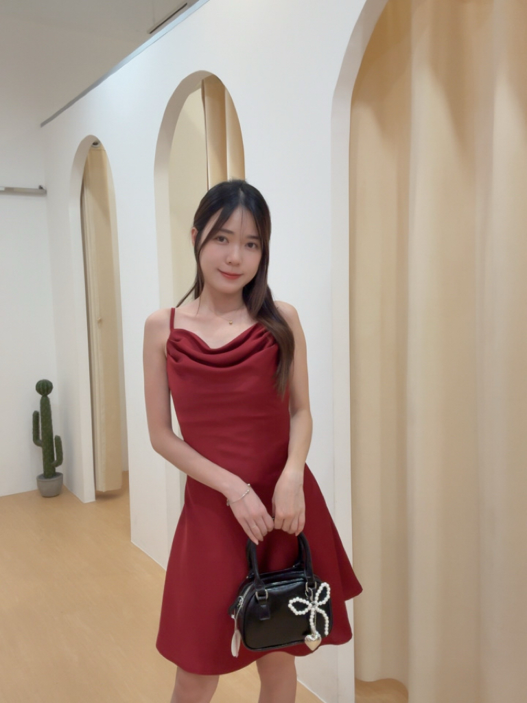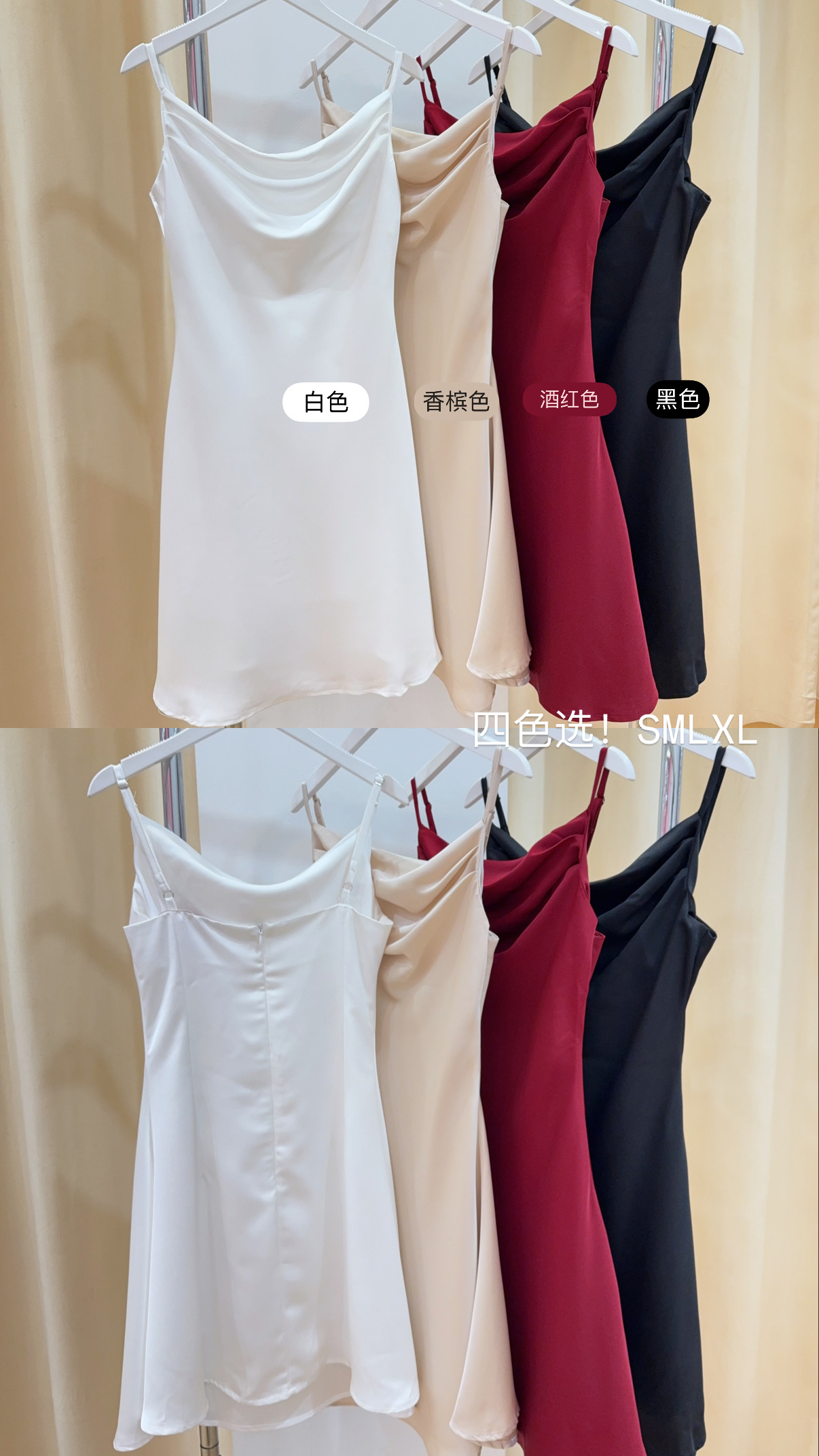 Code:R2869高级感缎面荡领修身A字小礼裙 Price: Rm69 Color :黑色Black / 白色White / 酒红色Red / 香槟色Champagne Size : S / M / L / XL S Bust : 76cm Length : 75cm Waist : 62cm Hip : 90cm M Bust:82cm Length:75cm Waist:66cm Hip:96cm L Bust:84cm Length:75cm Waist:70cm Hip:100cm XL Bust:90cm Length:75cm Waist:80cm Hip:108cm