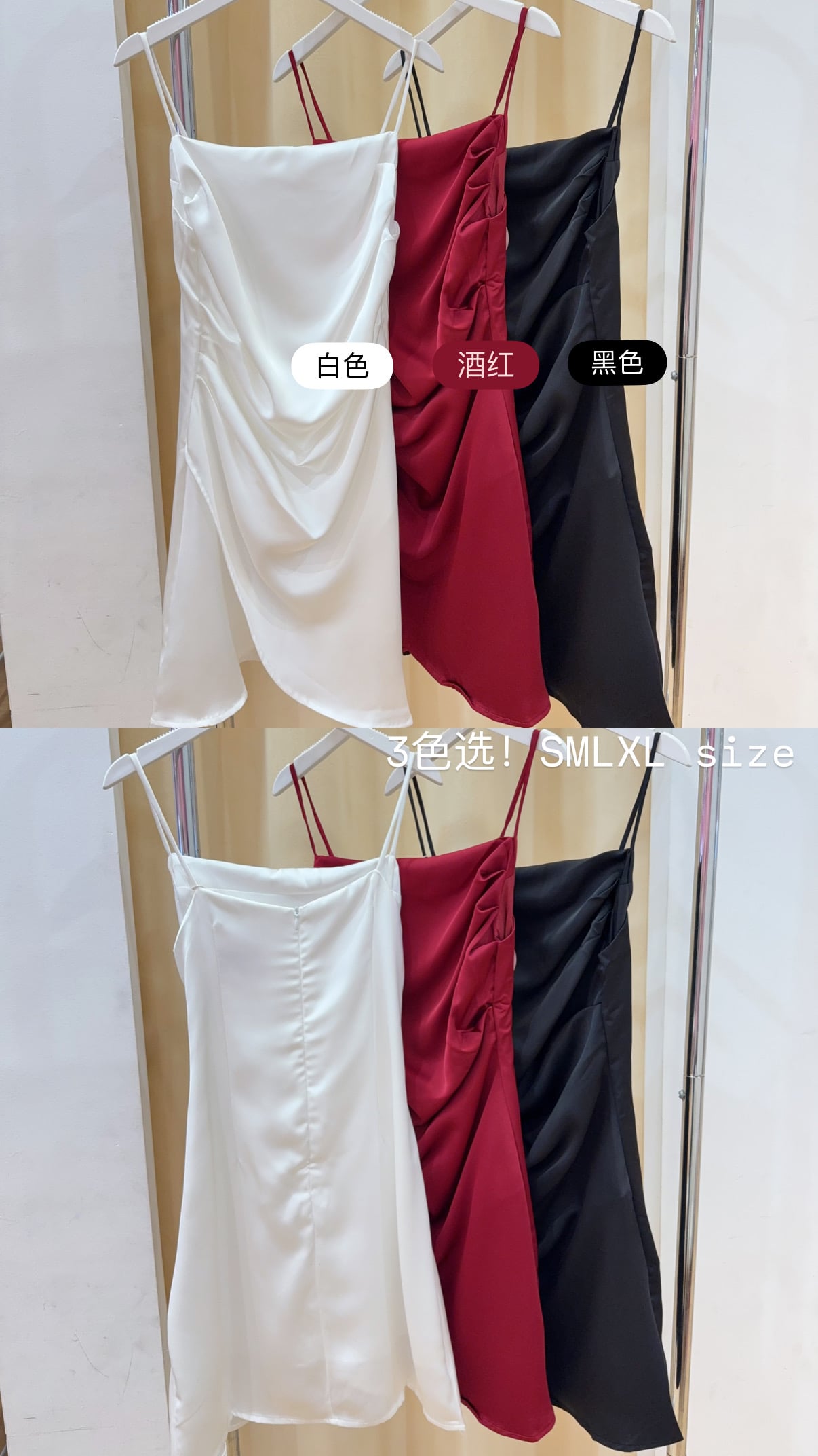 Code:R2868 高级感缎面褶皱交叠小礼裙 Price: Rm69 Color :黑色Black / 白色White / 红色Red Size : S / M / L / XL S Bust : 78cm Length : 78cm Waist : 68cm Hip : 80cm M Bust:82cm Length:78cm Waist:70cm Hip:86cm L Bust:88cm Length:79cm Waist:78cm Hip:90cm XL Bust:90cm Length:79cm Waist:82cm Hip:100cm